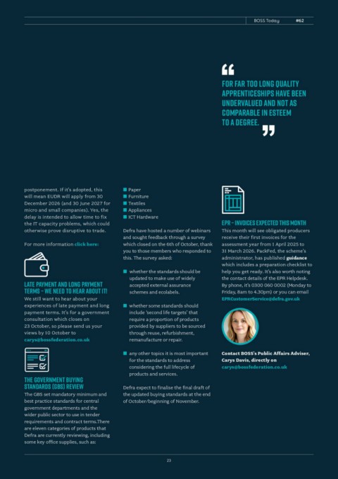 WELCOME TO YOUR BOSS LOBBYING BULLETIN FOR OCTOBER 2025. otherwise prove disruptive to trade. Defra have hosted a number of webinars This month will see obligated producers